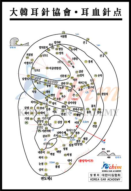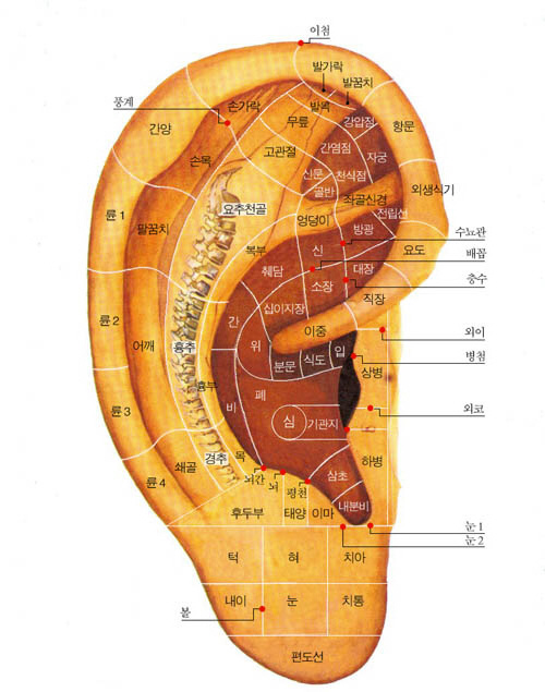 2. 귀이지: 심장. 구강. 인후. 식도. 자궁(전립선).신장. 풍계. 손가락. 팔꿈치. 교감. 대장 부분에