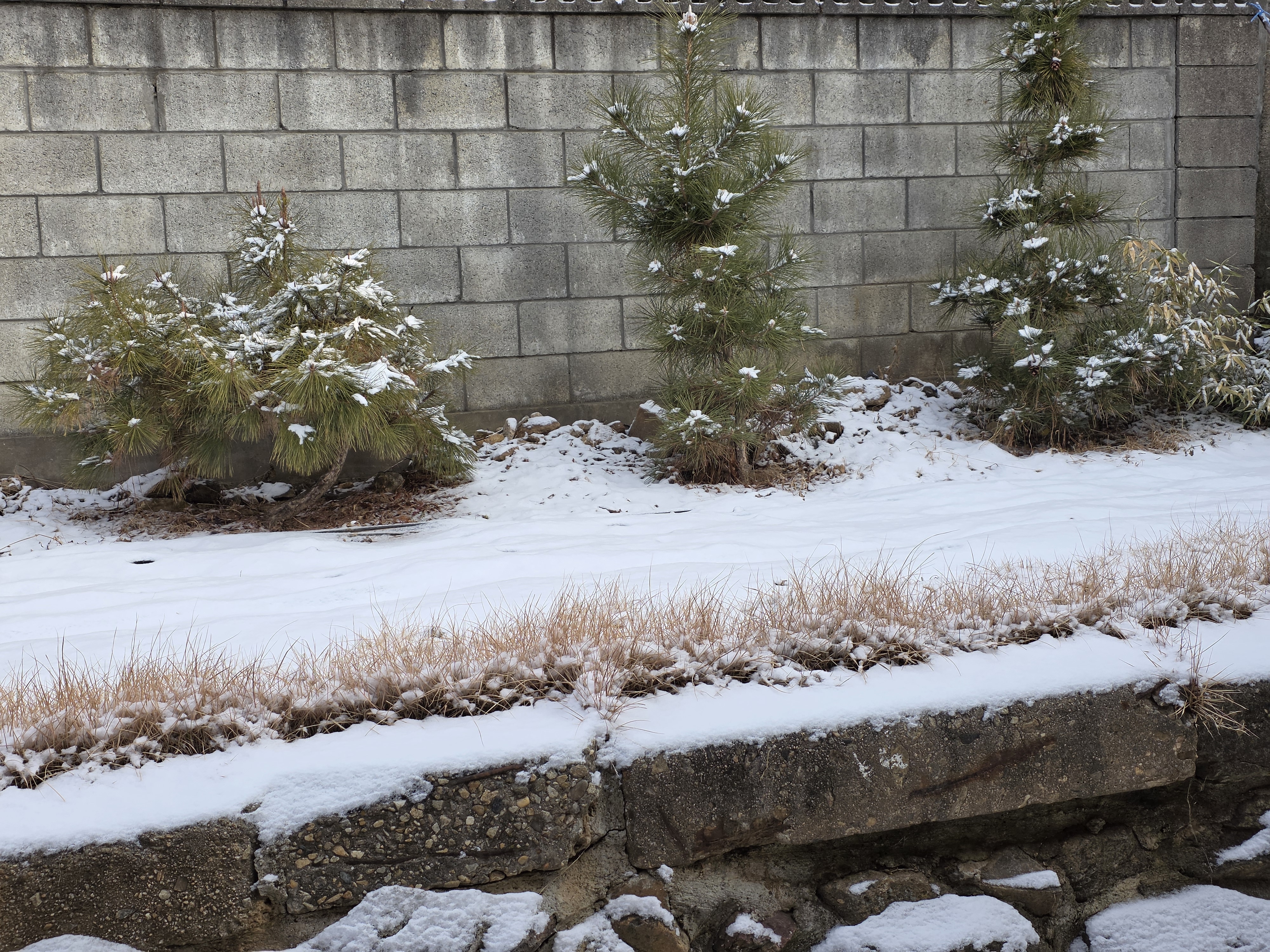 눈 덮인 소나무 세 그루와 대나무 한 그루가 만들어내는 시각적 대비,